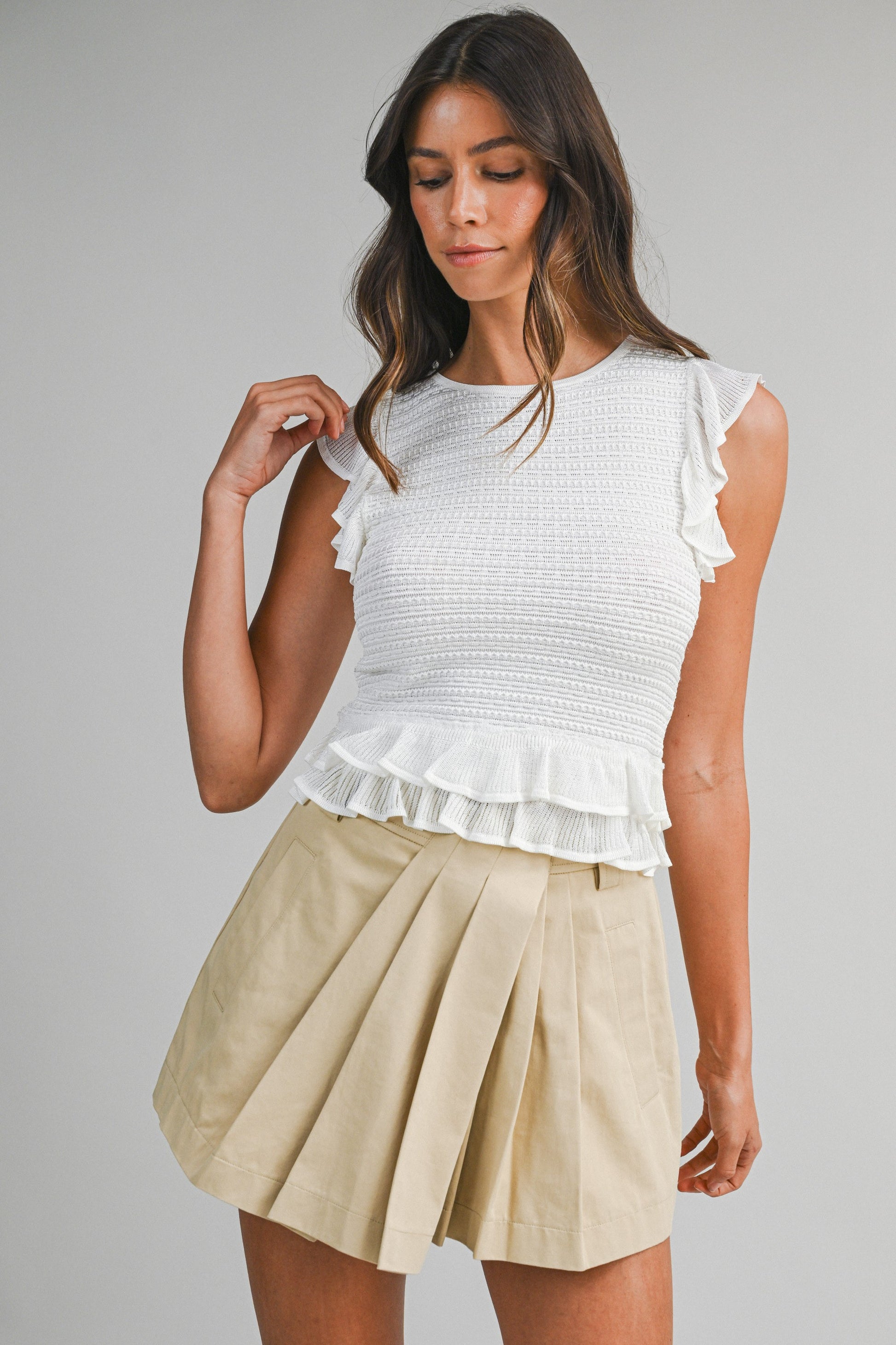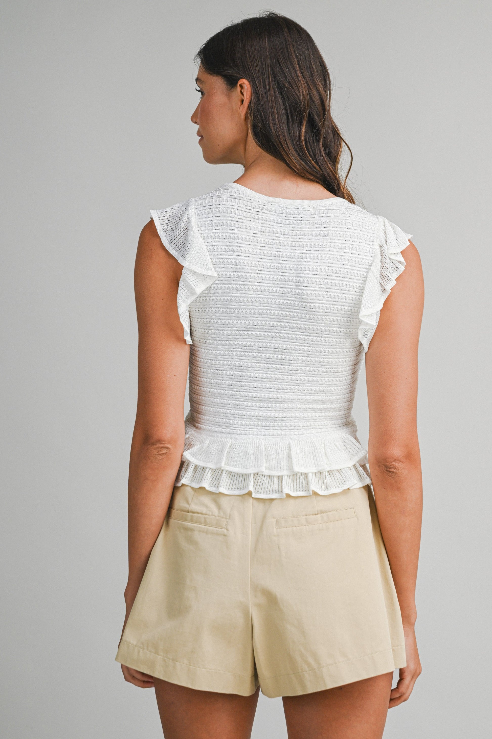 Textured sleeveless knit top with soft flutter sleeves, a fitted silhouette, and a layered ruffle hem detail.