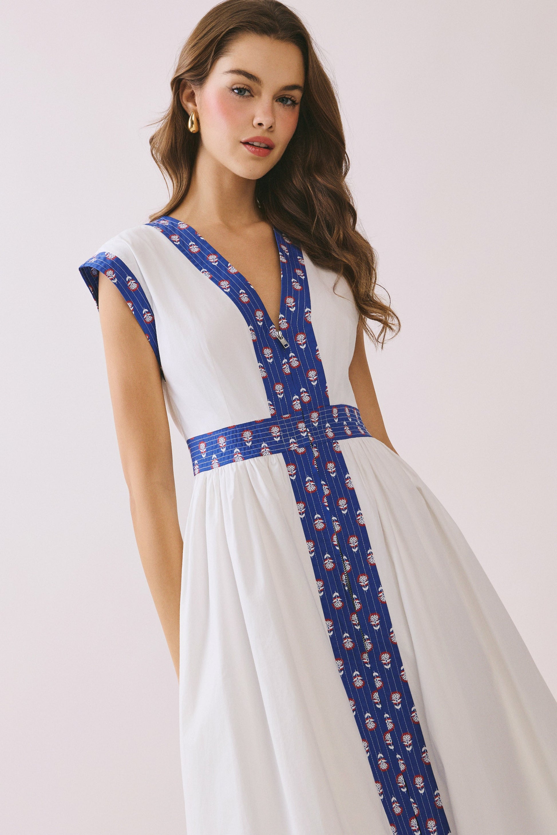 A midi dress featuring contrast printed trim along the neckline, sleeves, waist, and hem. Designed with a flattering V-neck, cap sleeves, and a gathered skirt.