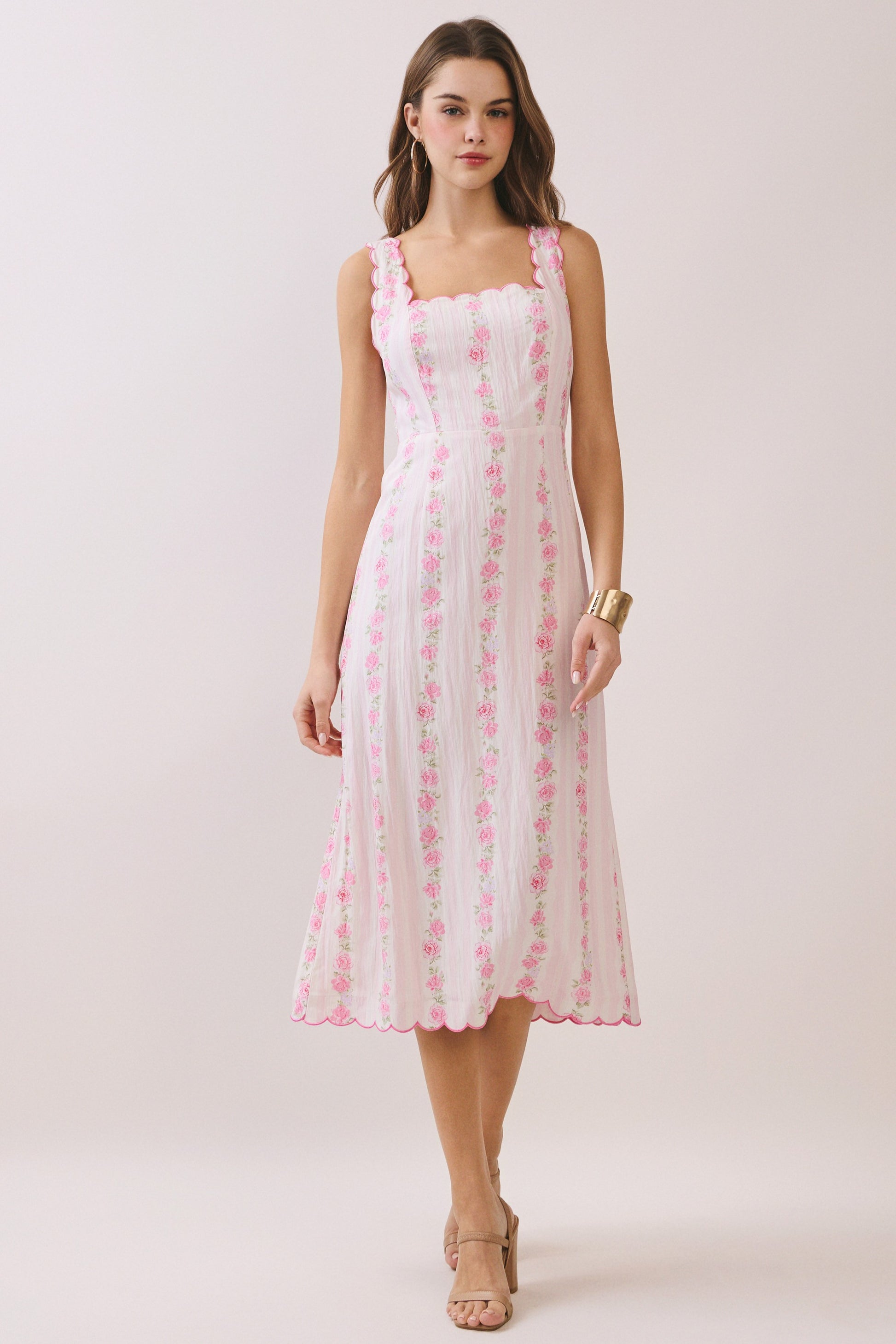 A sleeveless midi dress featuring a soft square neckline and wide scalloped straps. Designed with a smocked back bodice for a comfortable, flattering fit and a gently flared skirt with vertical floral stripe detailing. Finished with a back slit for easy movement and scalloped embroidered hem.