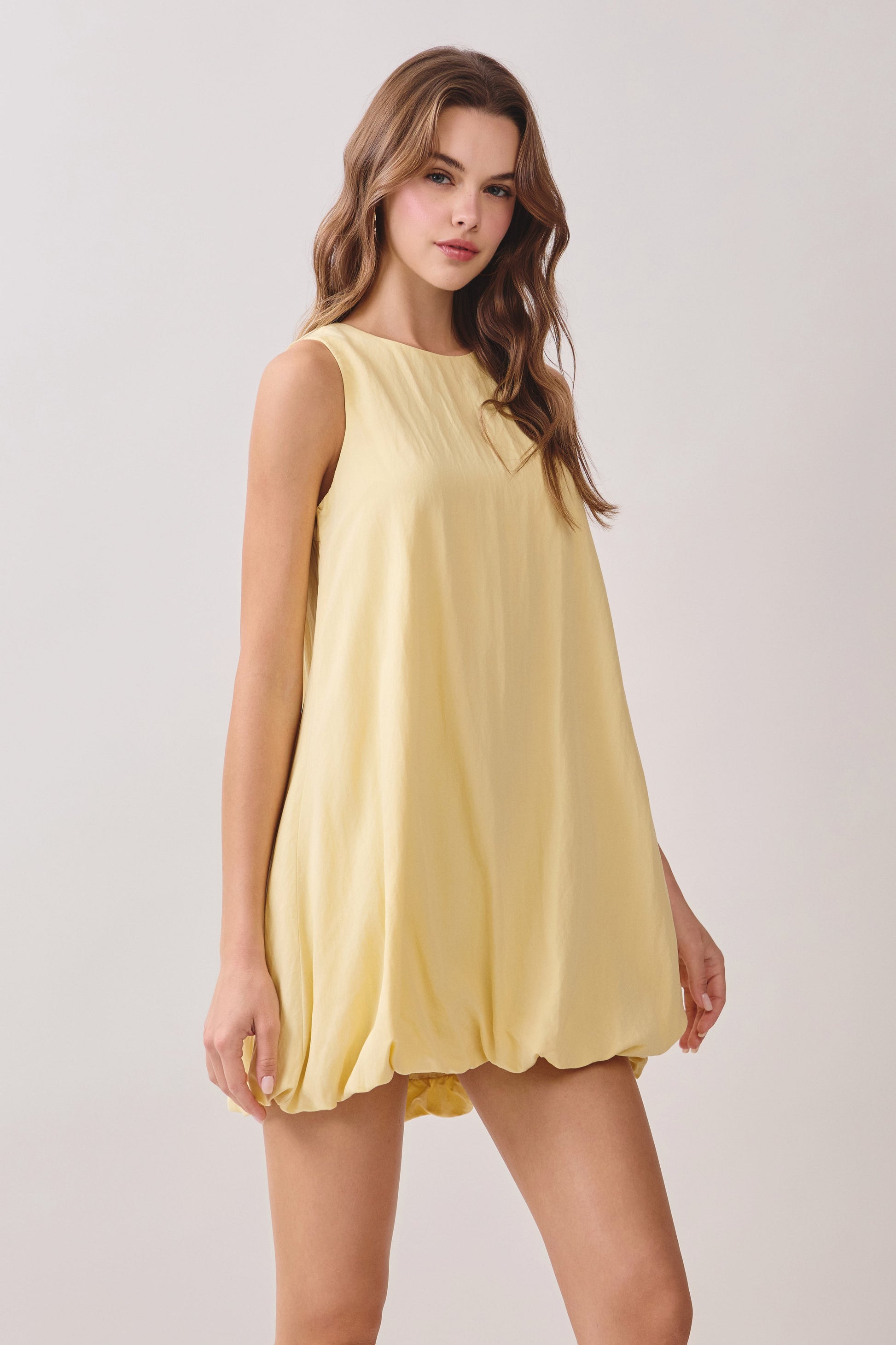 A sleeveless mini dress featuring a bubble hem silhouette and an open-back design with tie detail.