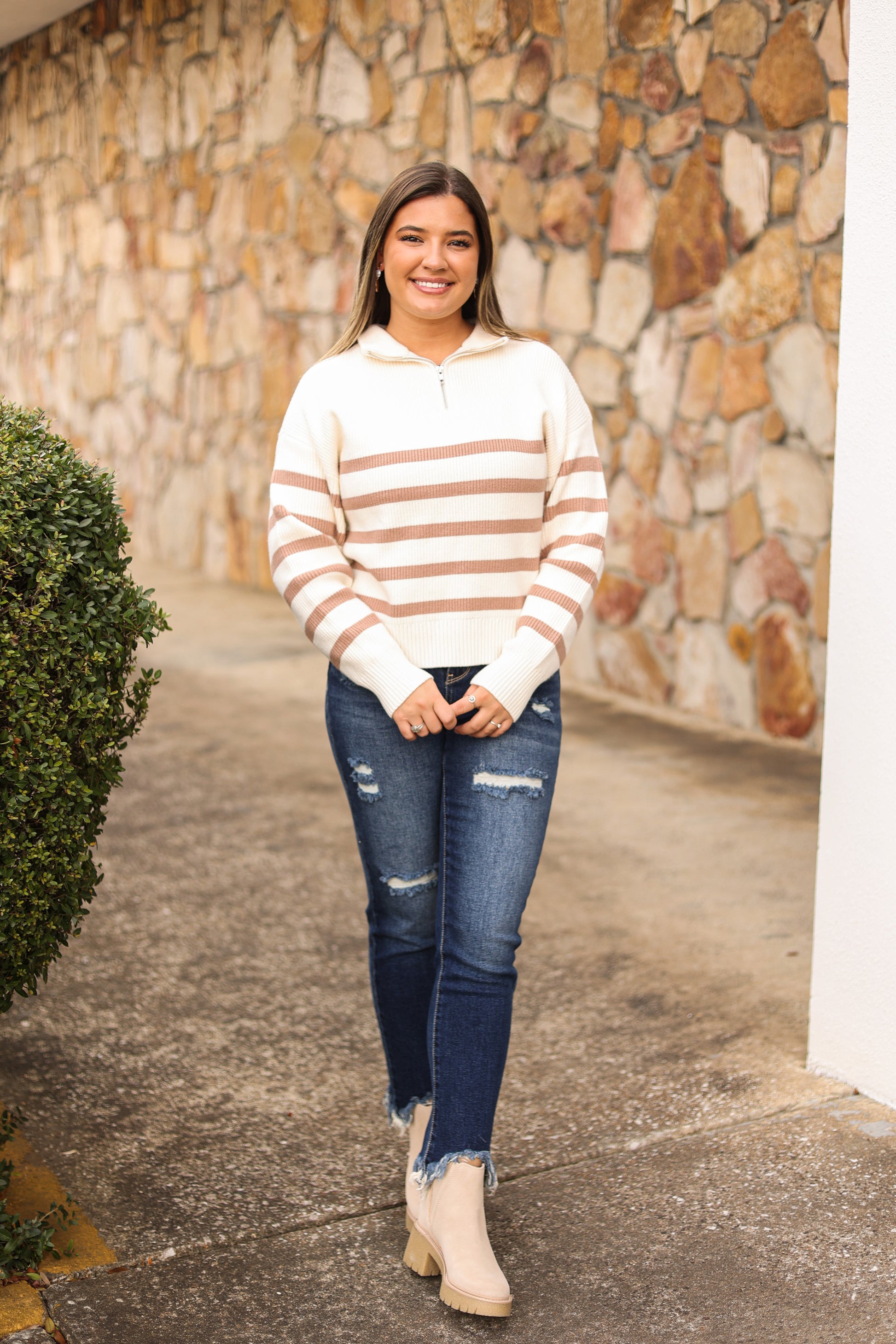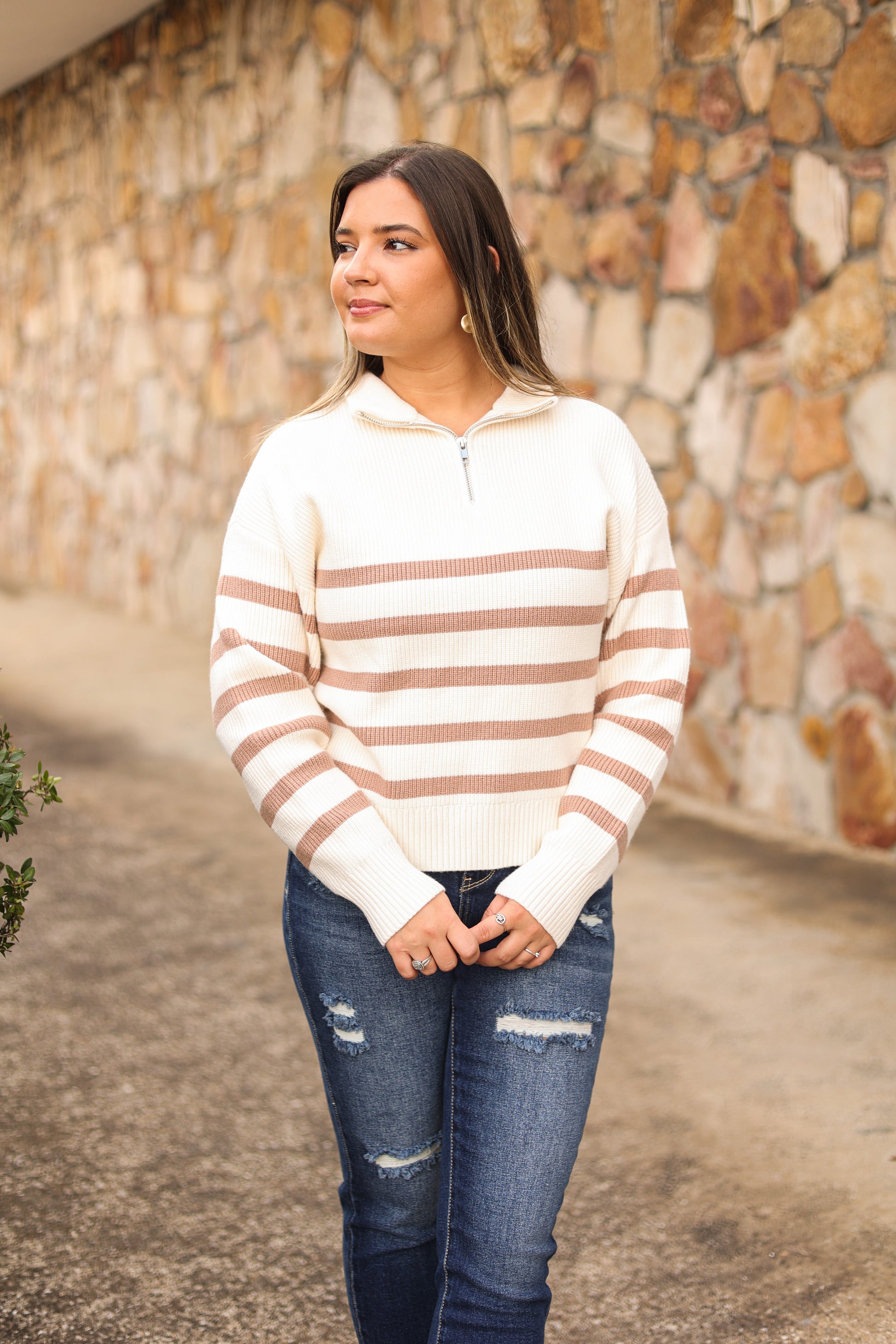 Our "Kayla Striped Quarter Zip Pullover" is a cream and camel colored striped quarter zip pullover. It is a ribbed material and has a quarter zipper at the top. Our model is wearing a size Small.