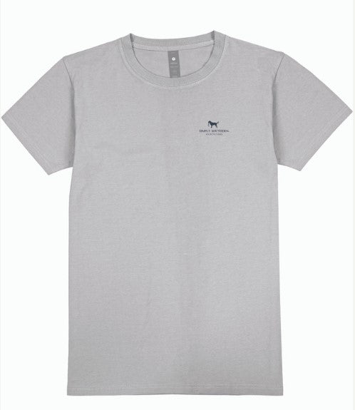 Fog grey short sleeve shirt with the phrase ' Just a good ol' 'merican dude' There is a flamingo with a USA flag hat holding a can of beer. Simply Southern logo below and on left chest. 100% cotton. Unisex sizing.