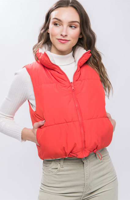 Look your best without sacrificing comfort in this Love Tree Cropped Reversible Puffer Vest in Tomato/Beige. This reversible vest features a cropped fit for a modern look that's perfect for any occasion. The tomato and beige colors will make a great addition to your wardrobe. Enjoy the ultimate in fashionable warmth and comfort!